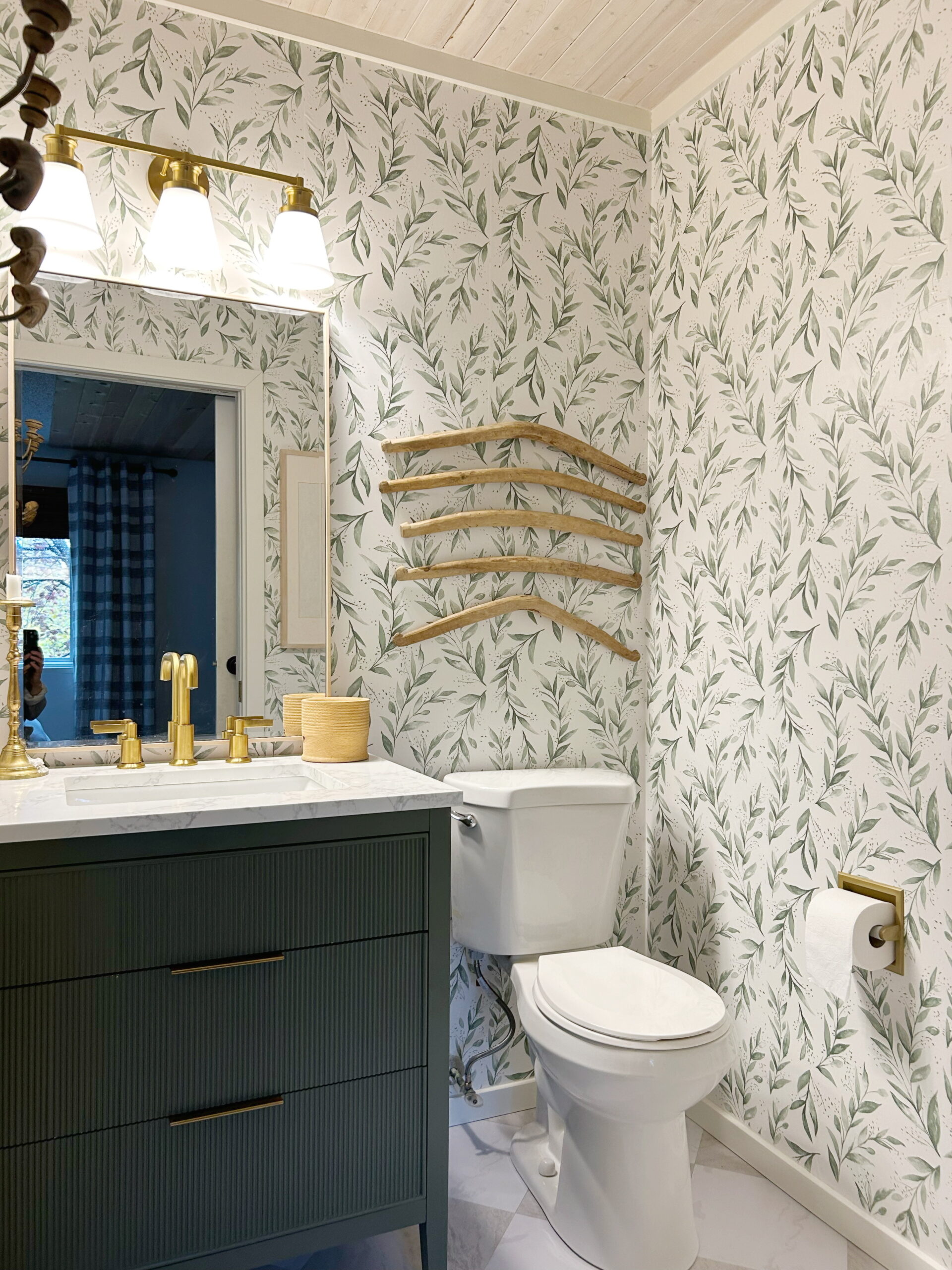 I love this sneak peek into the primary bathroom! Even though the bathroom is black, white, and grey, you can see the green in the mirror.