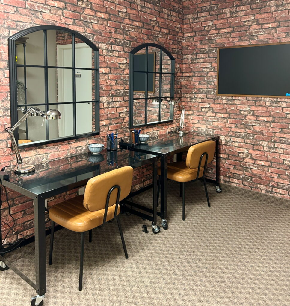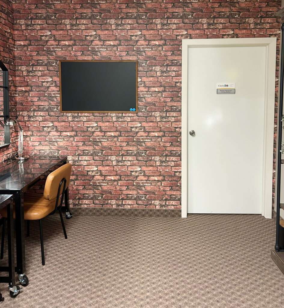 We added brick wallpaper to two of the walls. This helped create the cozy cafe feeling my client envisioned. We added a chalkboard. My client later added the Wi-Fi information and reminded parents that complimentary beverages were available as they waited.